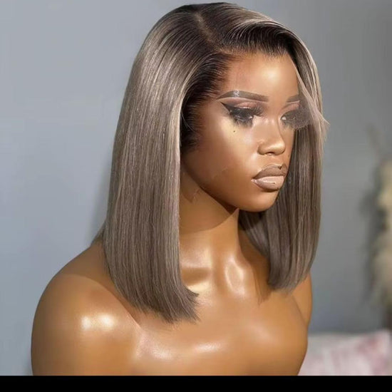 Ombre Ash Blonde With Brown Roots Colored Short Bob Wig 13x4 Lace Front Wig 180% Density Straight Human Hair Wig For Black Women